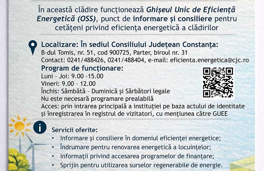 Consiliul Județean Constanța informează cetățenii că în sediul instituției funcționează Ghișeul Unic de Eficiență Energetică (GUEE), punct de informare și consiliere privind eficiența energetică a clădirilor.